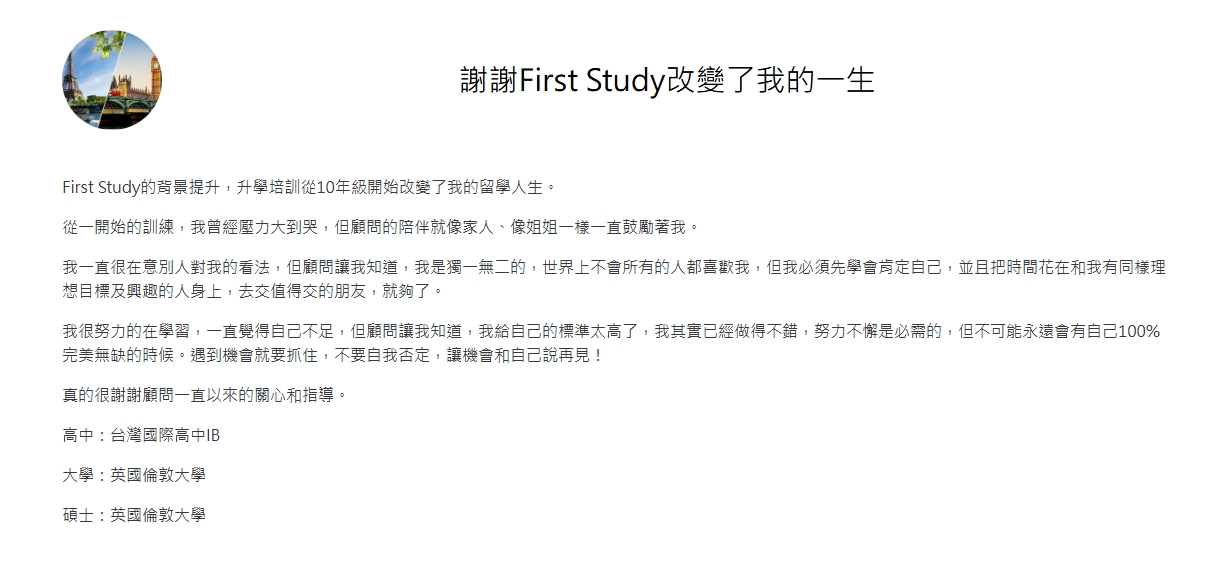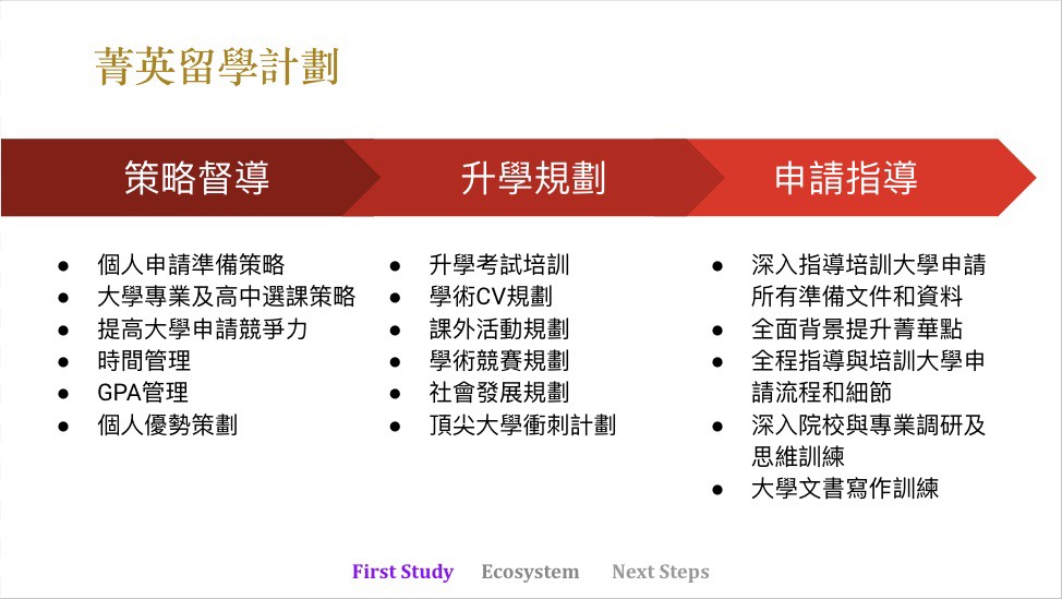 First Study 的顧問陣容,由畢業自史丹佛、普林斯顿、牛津、劍橋等頂尖學府的博士或教授領銜,結合教育界與產業界菁英,提供從小學、國高中、大學到研究所的一站式留遊學顧問服務。不論是留學申請、遊學進修、語言課程、豪華親子營、國際競賽、海外實習或科研發表,我們都能根據學生的背景與志向,量身打造最合適的升學路徑。客製化留學方案,專屬您的名校申請計畫我們深信,每位學生都是獨一無二的。First Study 不走制式化流程,而是根據每位學生的個性、興趣、優勢、能力與目標,設計最能讓你脫穎而出的升學途徑和履歷。我們與多所全球頂尖大學與教育機構合作,從學校選擇、科系分析、備審資料撰寫、面試指導到獎學金申請,提供全方位指導,確保學生申請最適合自己的學校與科系。提升全球競爭力,從留學規劃開始在 First Study,留學不只是申請學校,更是為未來職涯打下基礎。我們重視學生的就業力與全球競爭力,特別整合語言訓練、國際競賽、海外實習與教授科研等資源,全面提升學生的軟實力與硬實力,讓他們在畢業後能自信踏上全球舞台。高錄取率見證專業實力|常春藤與羅素集團錄取佳績不斷我們的學生成功錄取常春藤名校(Ivy League)、英國羅素集團大學(Russell Group)等世界頂尖學府。累積至今,近乎100% 的錄取成功率,印證了 First Study 在留學申請輔導領域的卓越成果。每一位學生的成功,都是我們專業與用心的最佳見證。三方溝通機制,讓家長與學生安心前行First Study 深知留學是一場學生、家長與顧問三方的共同旅程。我們特別設計季度導師會談制度,由專業導師與家長深度溝通學生近況,討論下一階段策略,確保目標一致、規劃連貫,讓家長放心,學生安心。